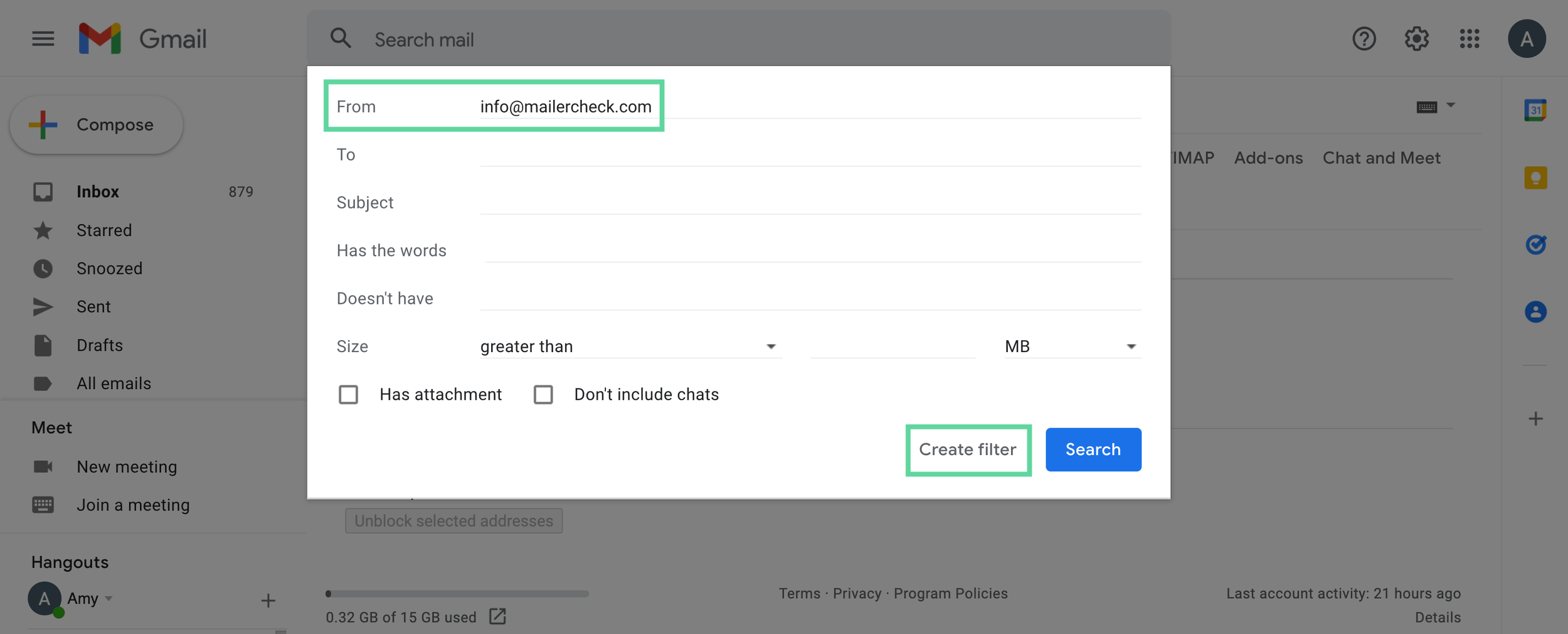 3. Simply add the email address you would like to allow in the From field and click Create filter.
