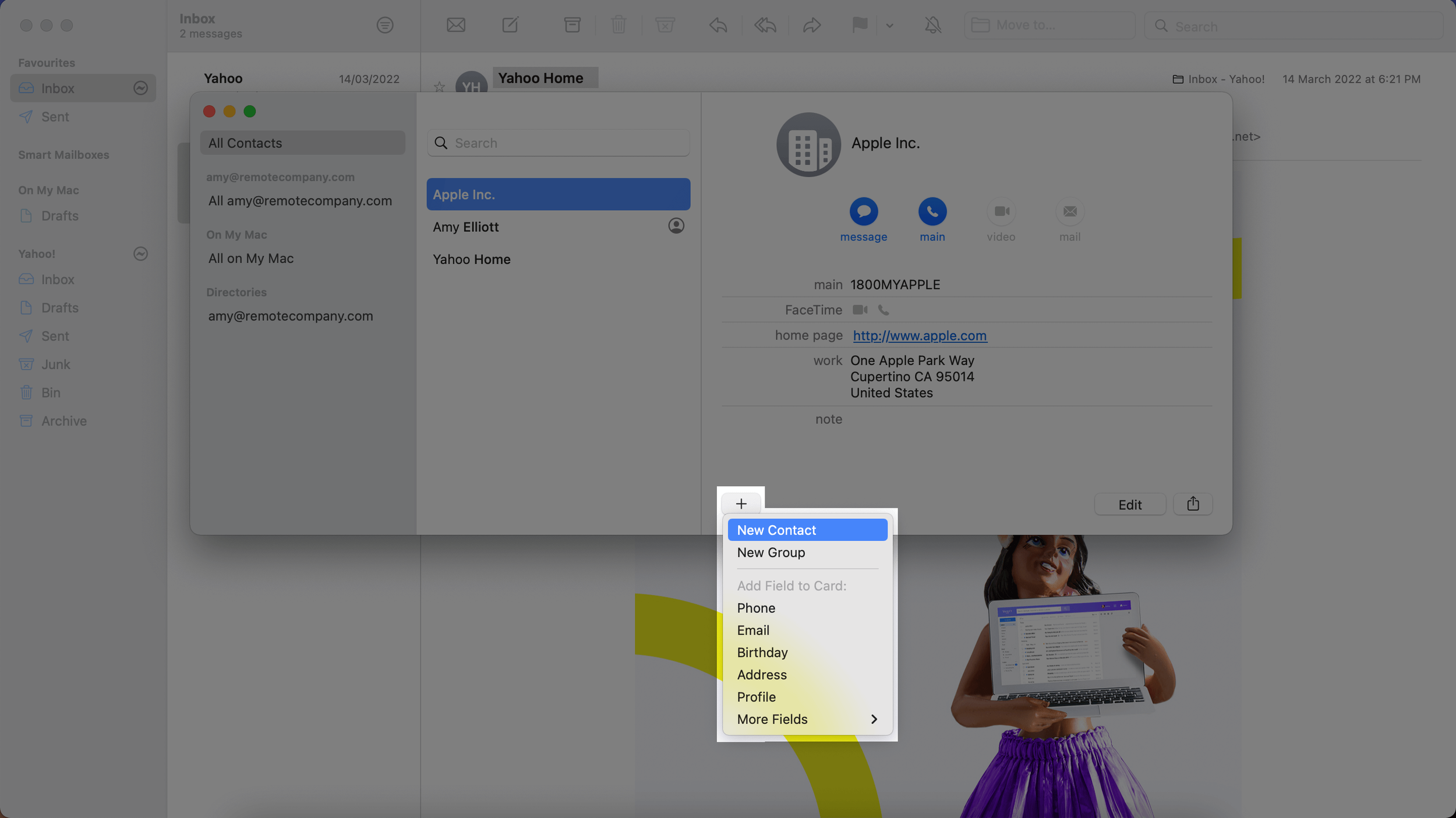 Alternatively, you can add a contact in the Contacts app. Open the app, click the Add icon and select New Contact. Enter the details and click Done.