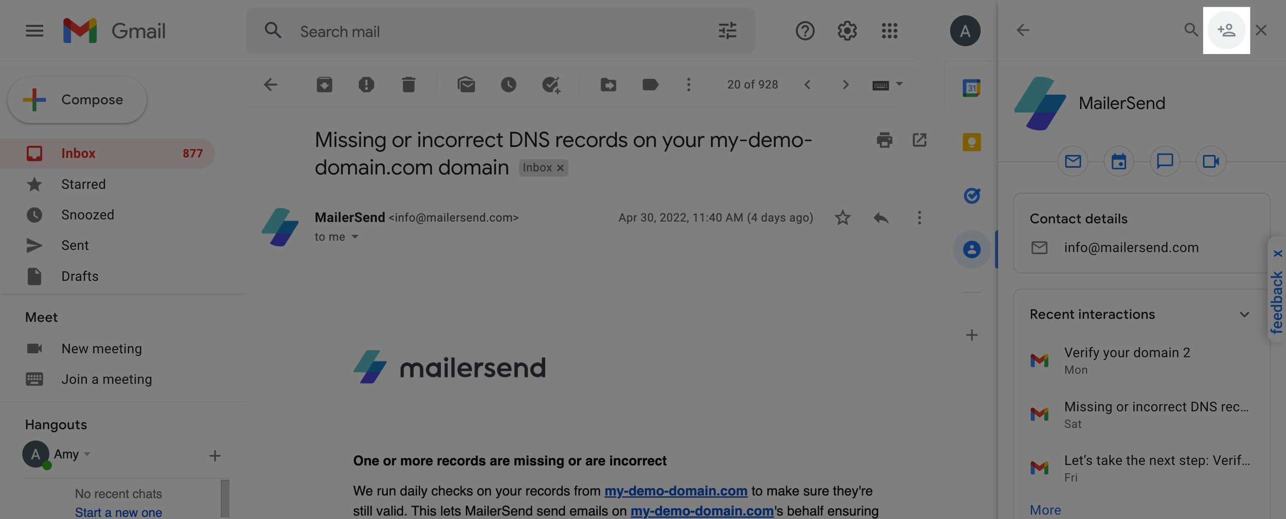 1. Open an email from the sender you would like to add to your contact list. Click the More icon at the top and then select Add sender to Contacts.