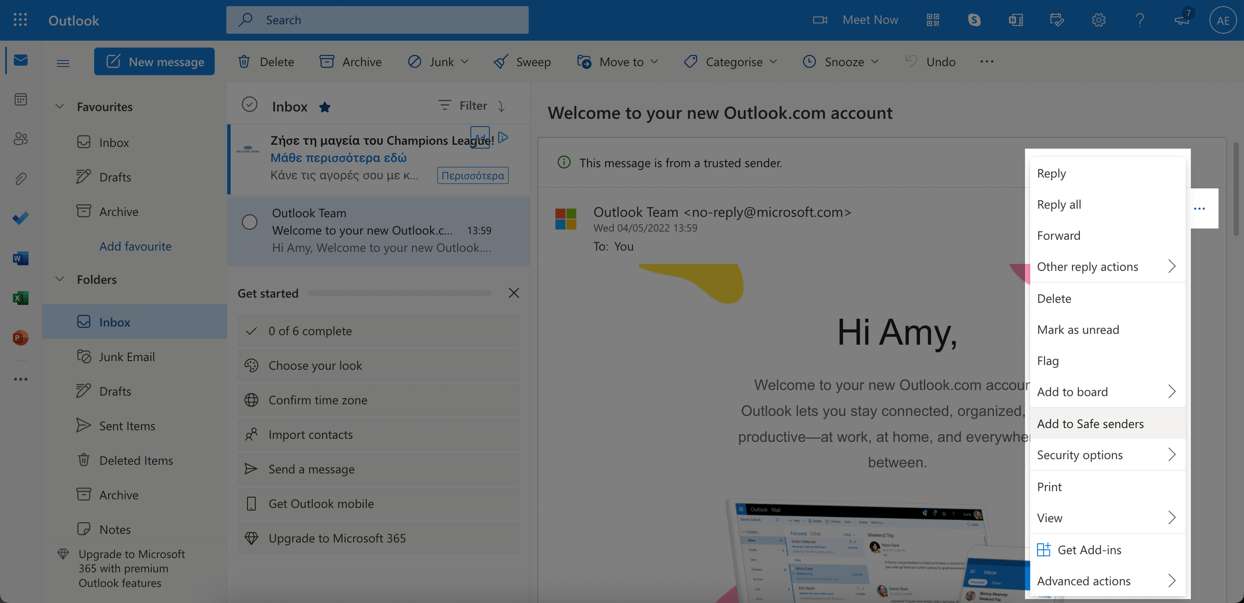 1. Open an email from the sender you want to add. Click More actions in the top right of the email to open the drop-down menu and select Add to Safe senders.