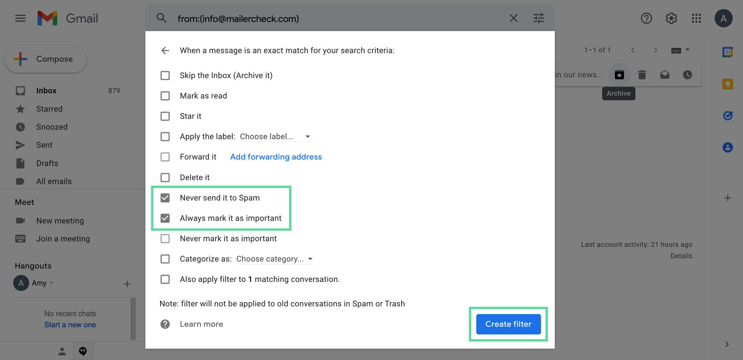 4. Select Never send it to Spam and (optionally) Always mark it as important. Click Create filter one last time and the email address will be added to your whitelist!